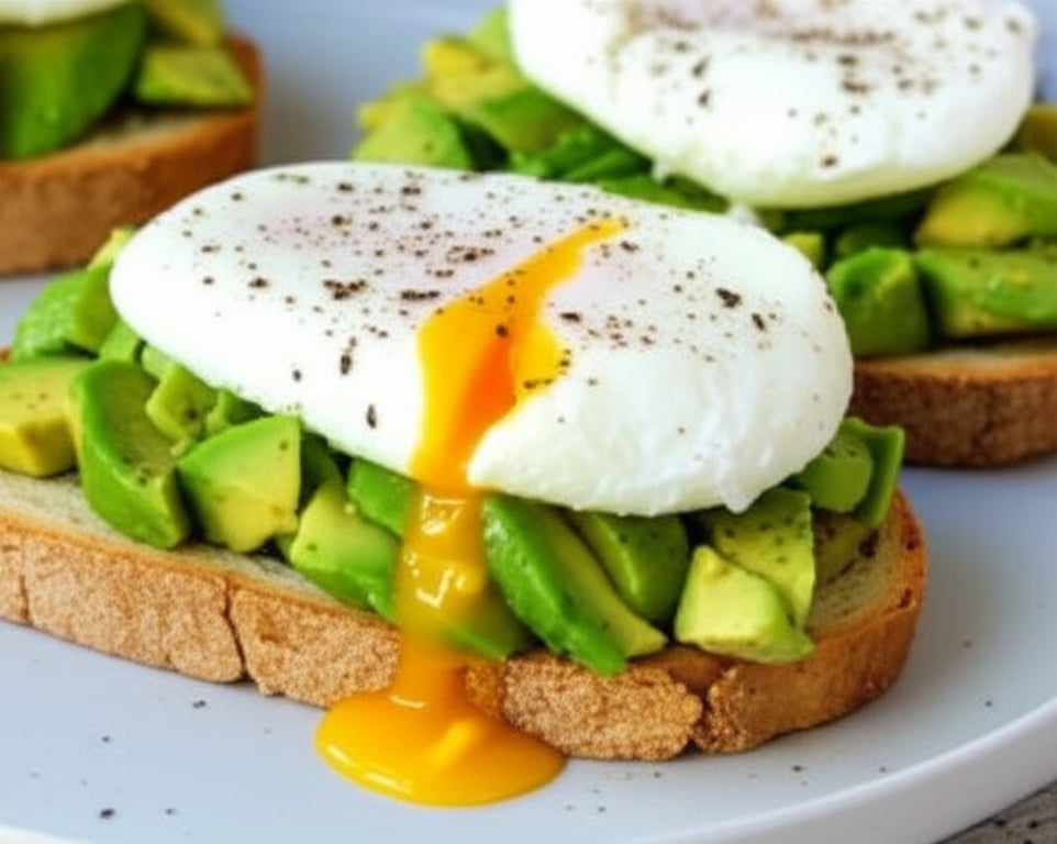 A simple and delicious breakfast or brunch option with creamy avocado and perfectly poached eggs on toasted bread.