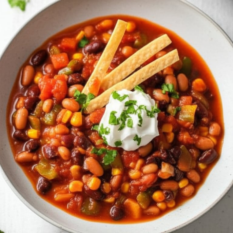 A flavorful and filling vegetarian chili packed with three kinds of beans, vegetables, and spices. Perfect for a chilly evening!
