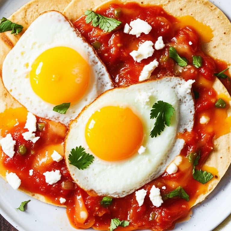 A classic Mexican breakfast featuring fried eggs served on corn tortillas, topped with salsa ranchera and cheese.