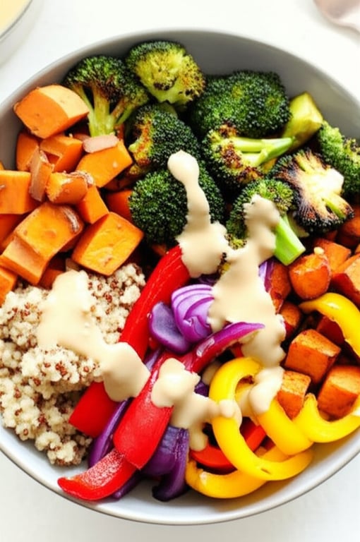 A vibrant and healthy bowl packed with roasted vegetables, grains, and a flavorful tahini dressing.